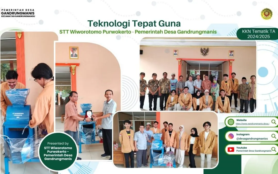Serah terima teknologi tepat guna dilakukan pada tanggal 26 Februari 2025 di Balai Desa Gandrungmanis Pukul 09.00 sampai dengan selesai. Kegiatan tersebut dihadiri oleh pihak pemerintah Desa Gandrungmanis, perwakilan STT Wiworotomo Purwokerto dan masyarakat setempat. Acara ini bertujuan untuk memperkenalkan dan mendemonstrasikan manfaat teknologi yang diberikan. Dalam perayaannya, Kepala Desa Gandrungmanis, Bapak Rasimin mengungkapkan rasa terima kasih kepada STT Wiworotomo atas inisiatif ini dan berharap teknologi yang diberikan dapat dimanfaatkan dengan baik oleh warga.