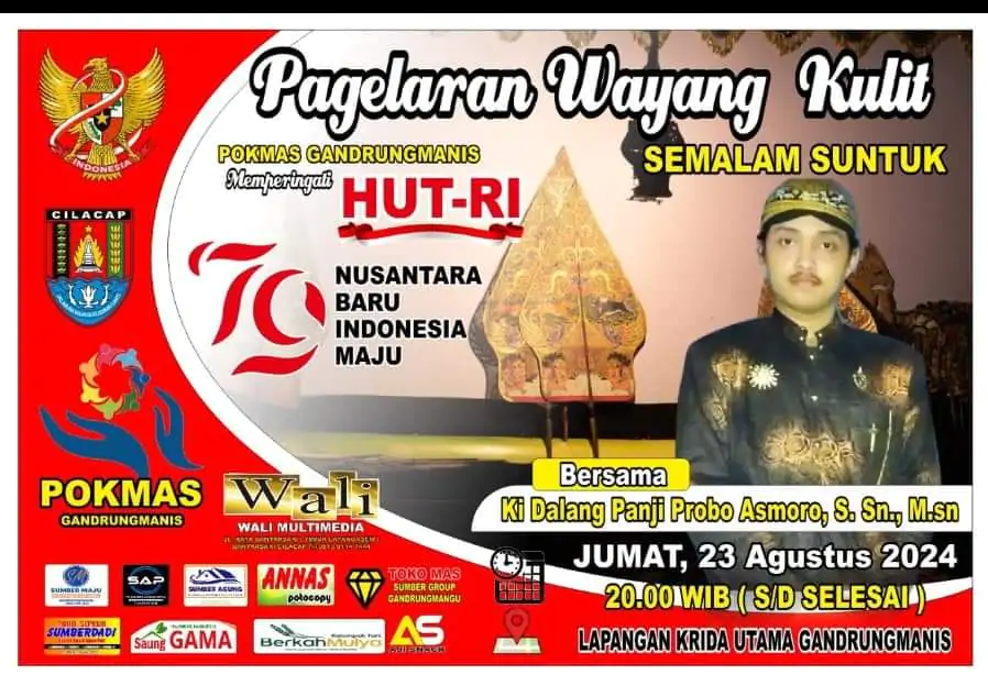 Memperingati HUT Kemerdekaan RI ke-79, Pemerintah Desa Gandrungmanis, Kecamatan Gandrungmangu, Kabupaten Cilacap, Jawa Tengah, menyelenggarakan pagelaran wayang kulit tradisional dari “Karawitan Condong Laras”. Acara ini diadakan pada 23 Agustus 2024 di Lapangan Krida Utama Gandrungmanis.