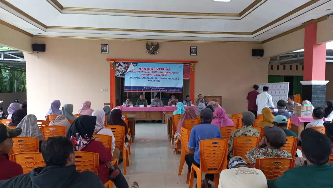 Pelaksanaan Penertiban Pertanahan di wilayah Desa Gandrung manis telah sampai pada tahap akhir yakni Pembagian Sertifikat Tahap Pertama kepada 60 warga. Pembagian dilaksanakan di Pendopo Balai Desa Gandrungmanis oleh Petugas PTSL dan disaksikan oleh BPN, Camat Gandrungmangu, Babhinsa, dan BPD.